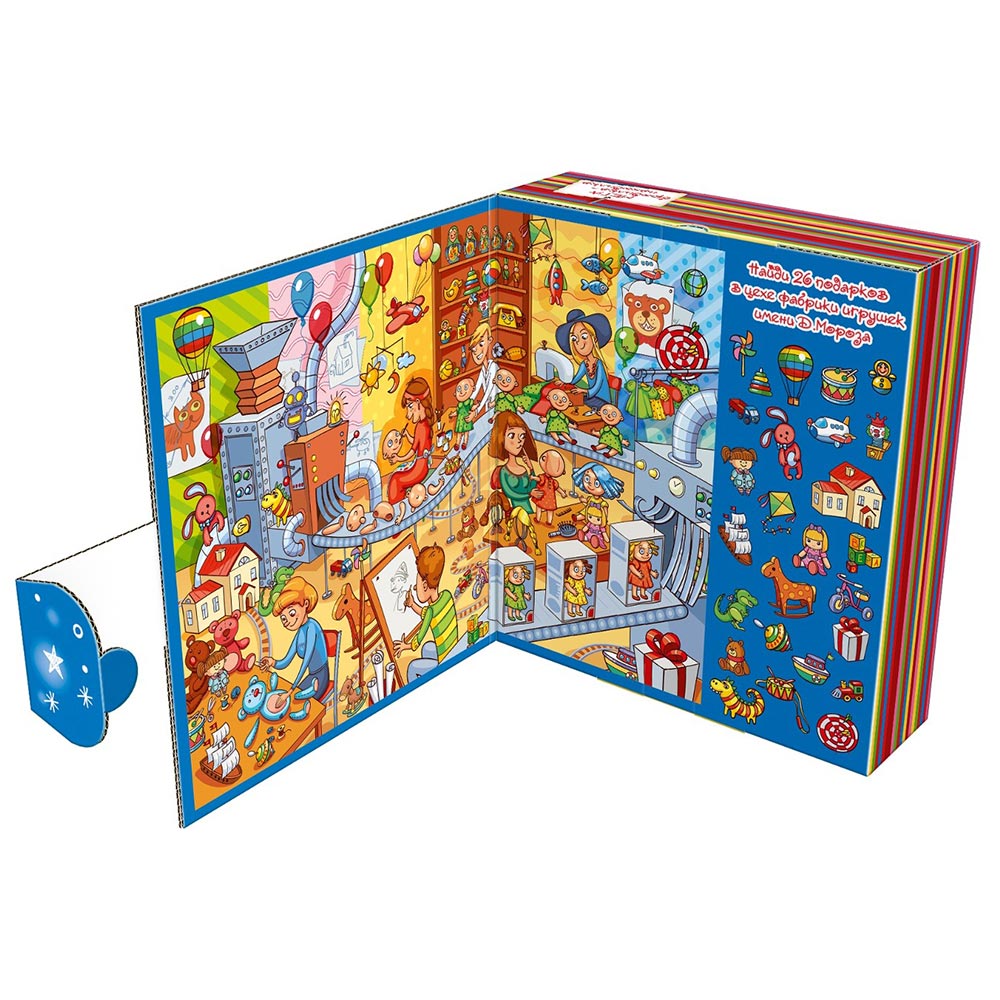 Игра-квест: найди подарок. Внутри коробки: набор карточек для квеста в отдельном конверте, большая новогодняя бродилка на развороте, задачи на логику и внимание.