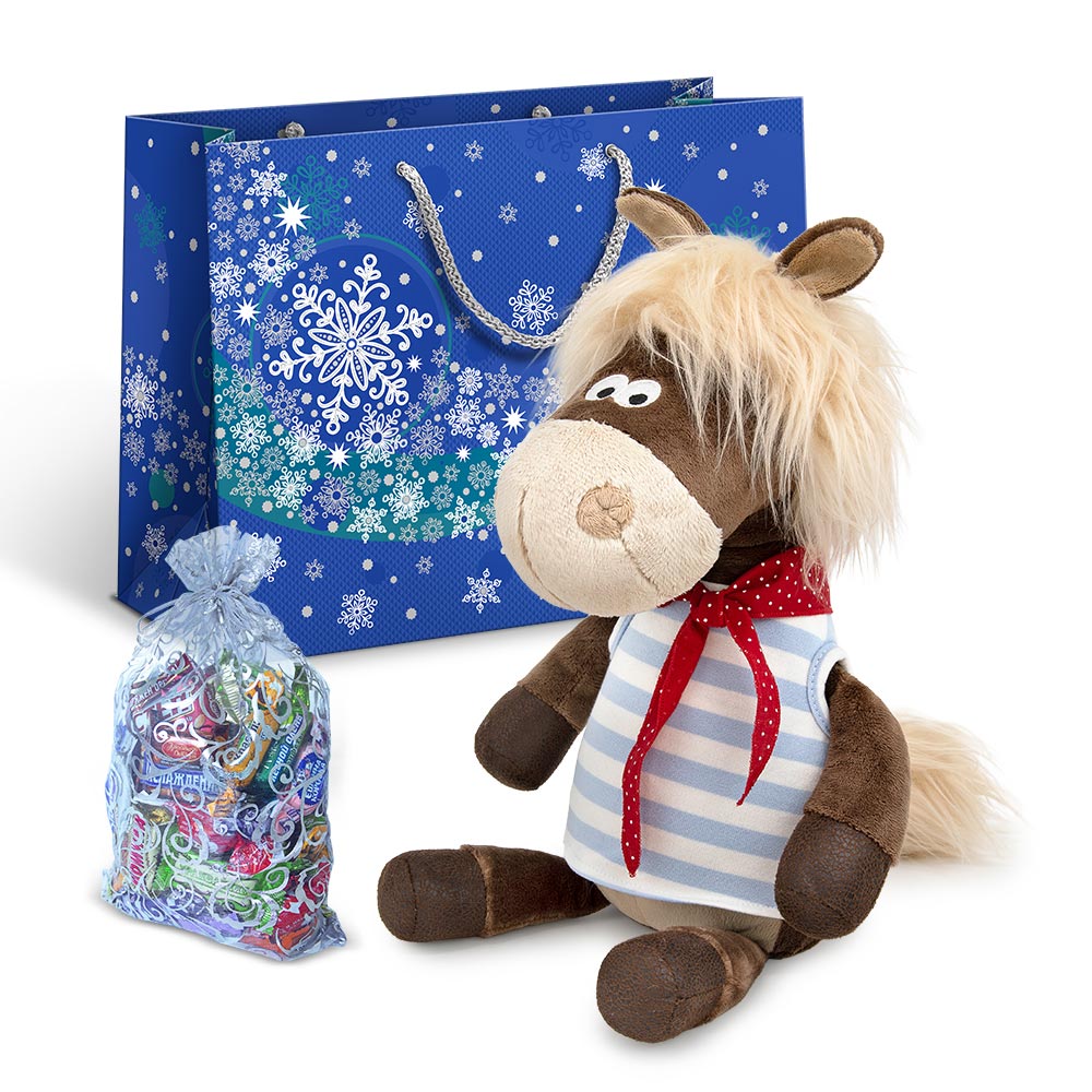 Набор Джонджо в новогоднем пакете с мягкой игрушкой символом наступающего 2026 года и мешочком со сладким подарком 800г Стандарт.